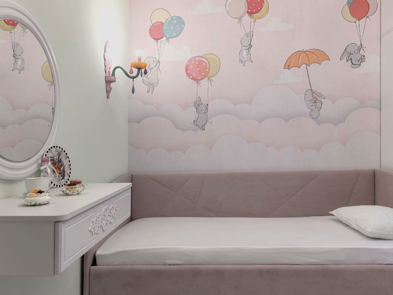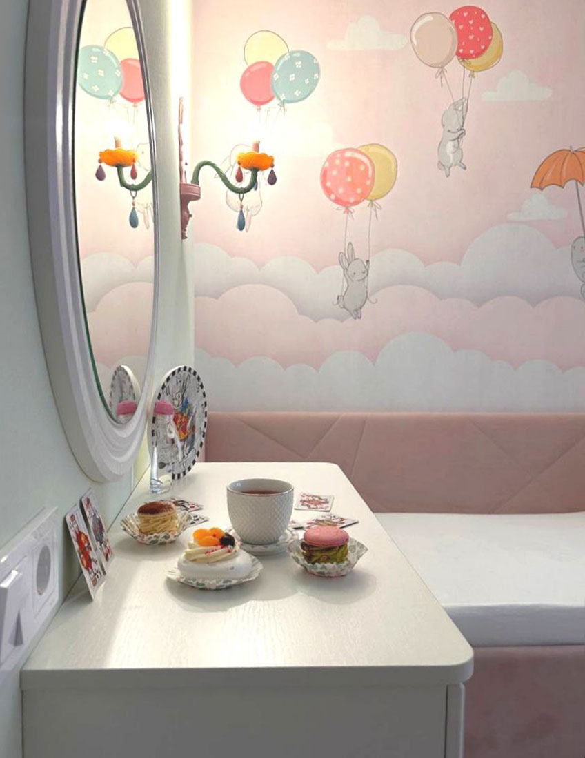 Далее переходим в детскую для девочки. Посмотрите на это милейшее изображение (Арт.33711) из дизайнерской коллекции «Для самых маленьких» от ОРТОГРАФ.  Нежные оттенки, волшебные мотивы - всё здесь создано для того, чтобы пробуждать в малышке самые светлые мечты и веру в чудеса.
