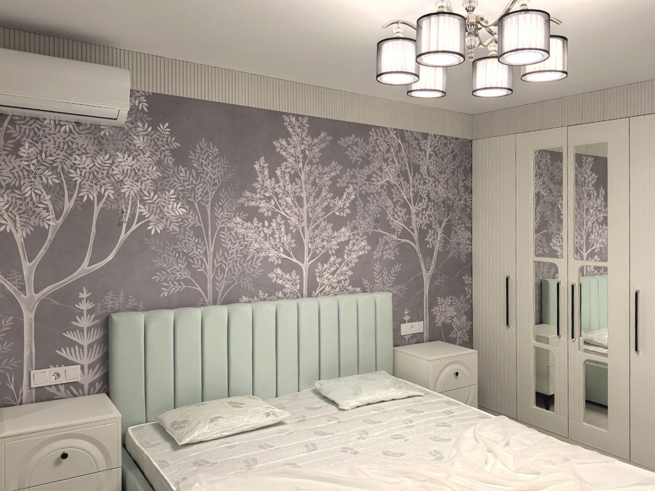 И, наконец, третье - это спальня, оформленная природным сюжетом (Арт.35449) из нашей дизайнерской коллекции «Albero». Величественные деревья, легкий ветерок и спокойствие леса - что еще нужно для идеального отдыха и полного расслабления после долгого дня?