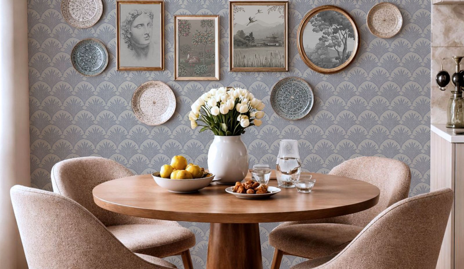 Галерея – это не только картины и фотографии. Объемный декор придаст вашей композиции глубину и уникальность! Металлические панно, декоративные тарелки и другие элементы, размещённые как в строгом порядке, так и в свободной, чуть хаотичной манере, создадут эффект эклектики, добавят нотку домашнего уюта и разнообразят визуальное восприятие.